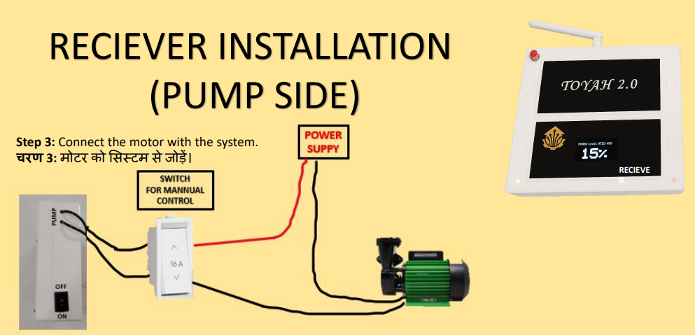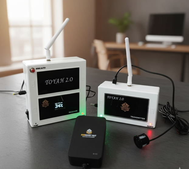 The TOYAH 2.0 Wireless Fully Automatic Water Level Controller is a complete solution designed to automate and protect your domestic water pumps. Unlike conventional controllers, this system is engineered to work with motors without starters panel. This advanced system features three modes of operation – Fully Automatic, Semi-Automatic, and Manual Mode – allowing users to choose the most convenient way to manage water flow. The OLED display provides a 24×7 real-time percentage reading of water level, so you always know the exact status of your overhead or underground tank. With this feature, water wastage is minimized, and you gain complete visibility over your water usage. The built-in Dry Run Protection safeguards the pump by cutting off power when water supply is stop, preventing costly motor burn-outs. In addition, the Auto Cut-Off function ensures that once the tank is full, the pump automatically switches off, saving energy and avoiding overflow. Using a wireless transmitter and receiver system, the controller offers reliable operation with a range of up to 5 kilometers. It does not require SIM cards, Wi-Fi, or any paid subscriptions, making it cost-effective and maintenance-free. Its contactless ultrasonic sensor, protected with resin and rated IP64 waterproof, guarantees long service life even in tough environments. The system is designed with user safety and convenience in mind. Its shock-proof housing, dedicated filter technology, and buzzer alerts for full or empty tanks ensure safe and efficient performance. For extra flexibility, a manual ON/OFF option is always available, allowing you to override the automatic system whenever required. In case of any technical fault, the device includes an easy bypass feature, so your water supply is never interrupted. Installation is straightforward, and the package includes everything needed to get started: 1× Receiver Unit 1× Transmitter Unit 2× 5V DC Adapters 2× Antennas 1× Ultrasonic Sensor 1x Male-Female 2 Pin Plug 2 Meter Extensible Wire for Pump The TOYAH 2.0 Wireless Water Level Controller is built for Indian households and industries that need a reliable, internet-free, and easy-to-use solution for managing water. With its universal compatibility – covering motors without starters.. Backed by a 6-Months replacement warranty for internal fault only and a brand known for durable smart home solutions, this controller gives you peace of mind while ensuring your motor and water supply are always protected.